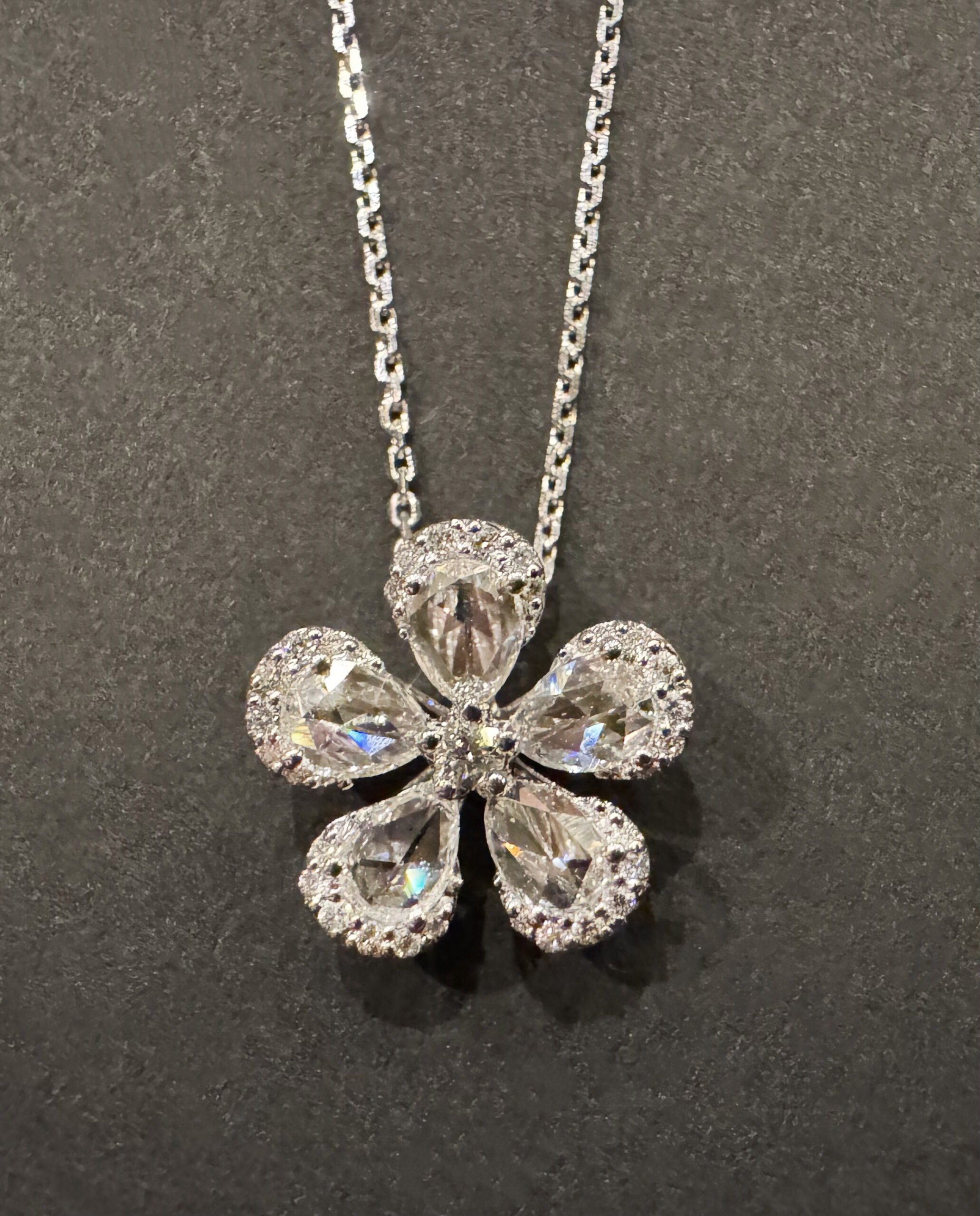 端正なフラワーの花びらにペアシェイプのローズカットダイアモンドがセッティングされたペンダント。
