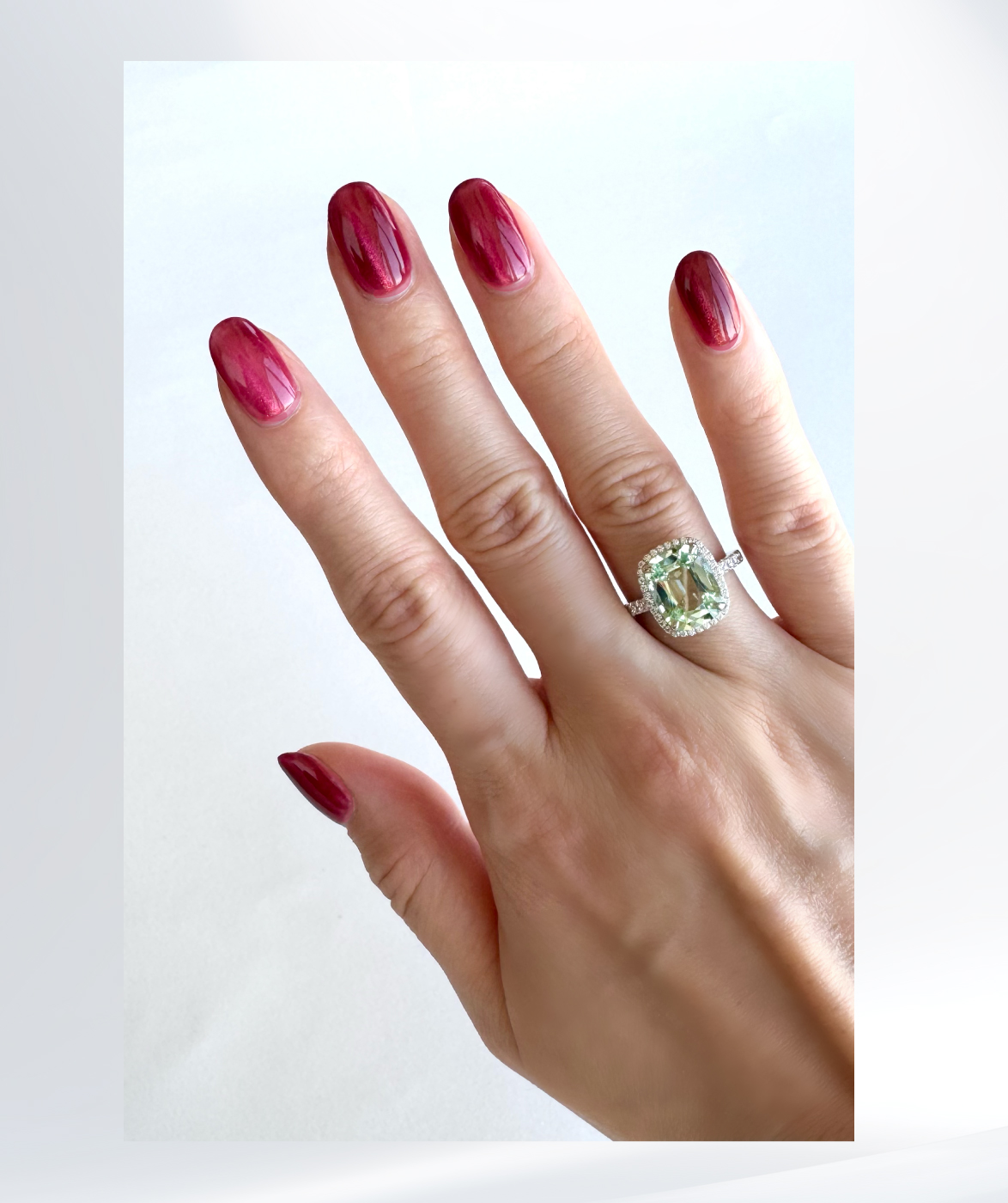 角度によっては7色の輝きも見せる絶妙なミントグリーンは、ハッとするような手元を演出します。