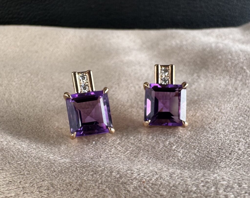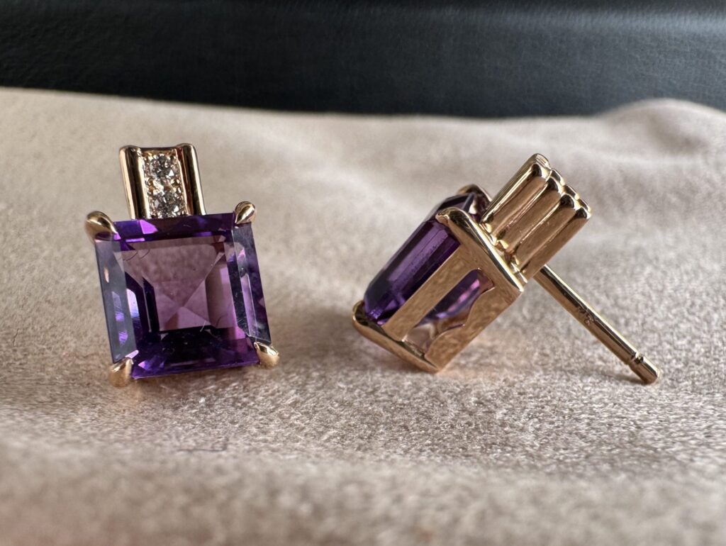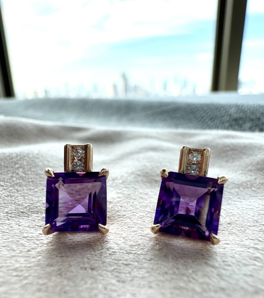 ステップカットのアメジストを使用したピアスをフルオーダーで製作いたしました。
